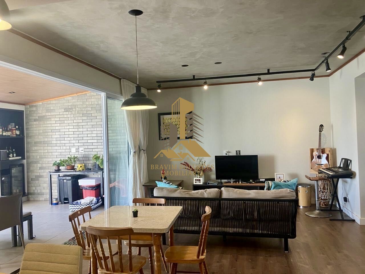 - Sala de estar e jantar integradas, com painel e rack planejados.
