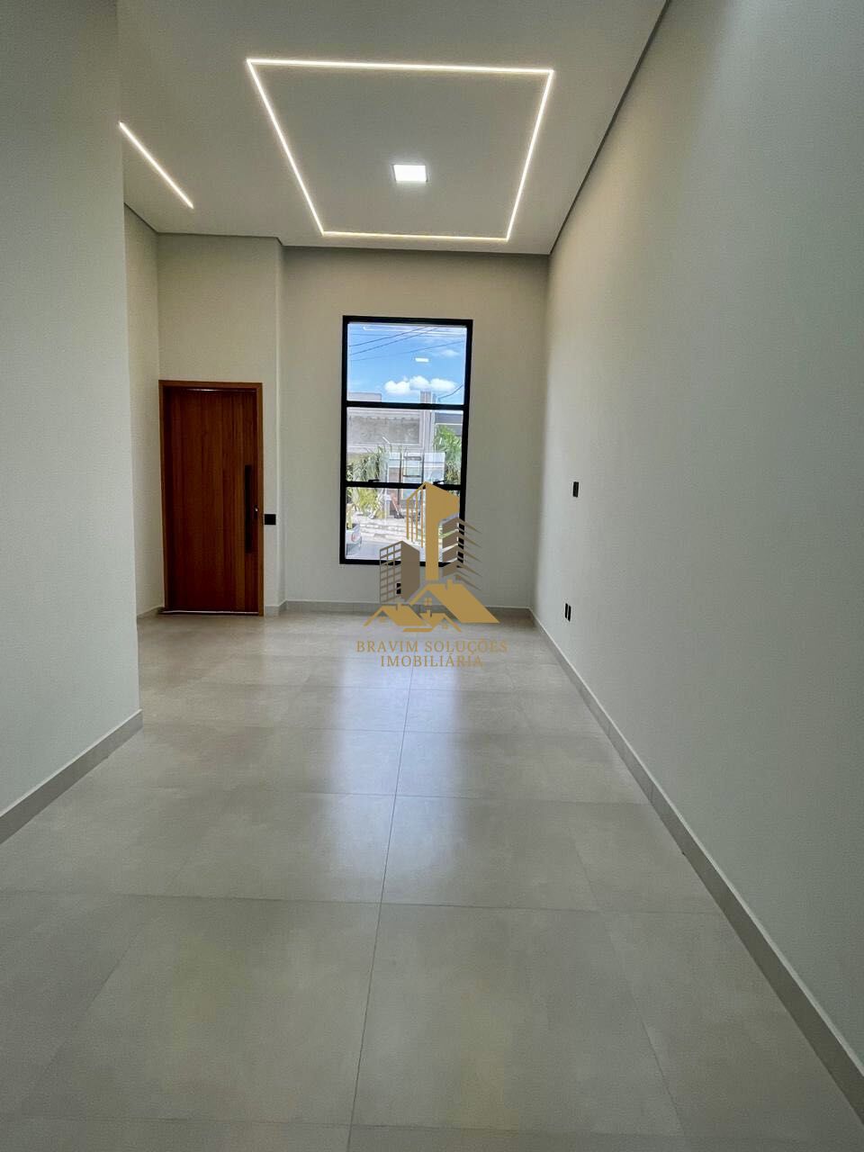 A sala com pé-direito alto impressiona pelo design e iluminação natural, com pele de vidro, porta painel em madeira ripada, fechadura digital e painel lateral da garagem com iluminação em LED, trazendo sofisticação desde a entrada.